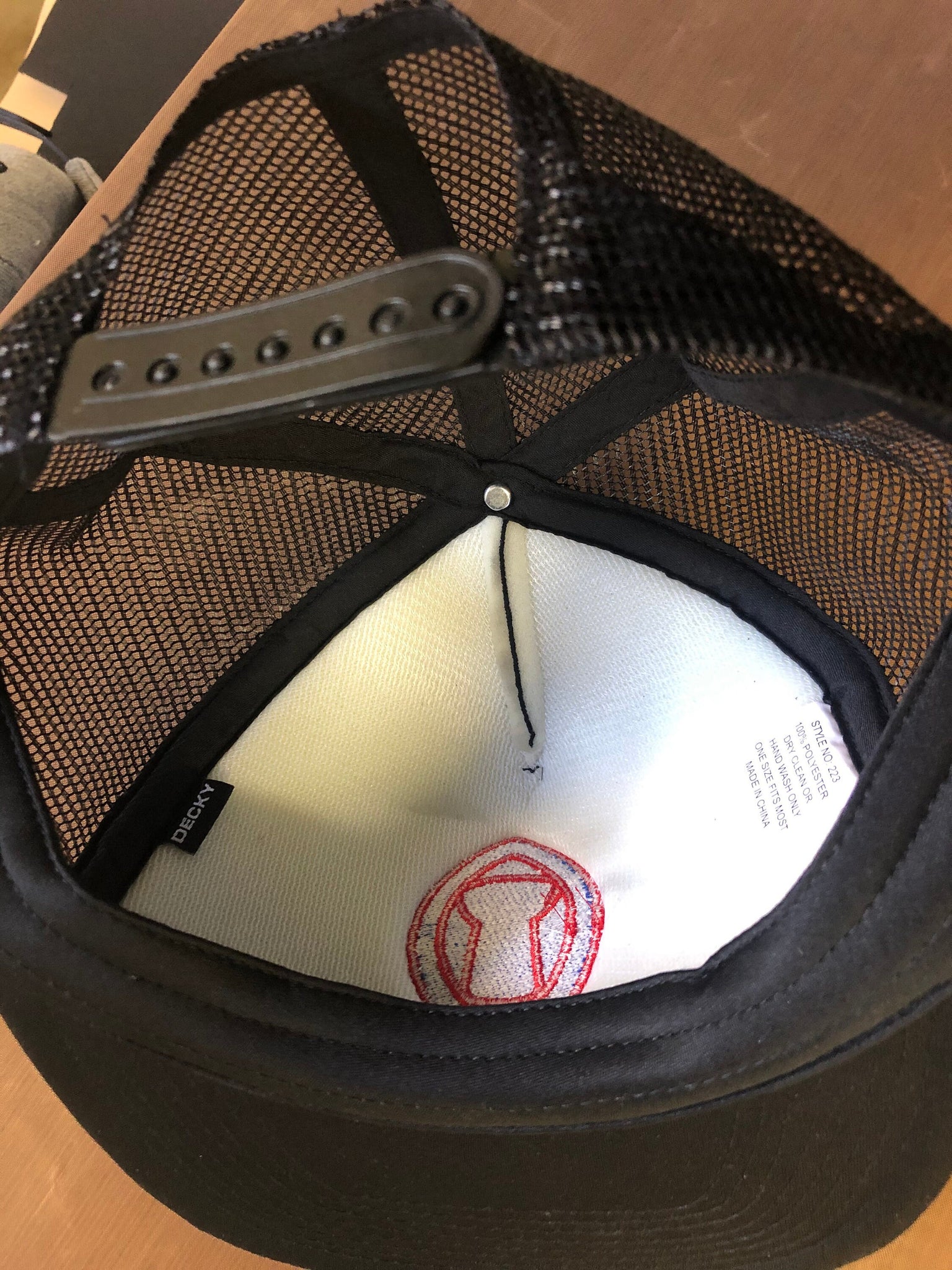 Black Foam Trucker Hat embroidered with the Guam Seal and Latte Stone in Navy Blue and Red.